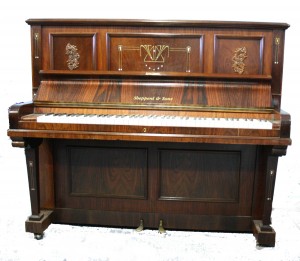 This immaculate upright piano with intricate mother of pearl inlay and ornate design has been restored to its former glory. The rich wood is rosewood.